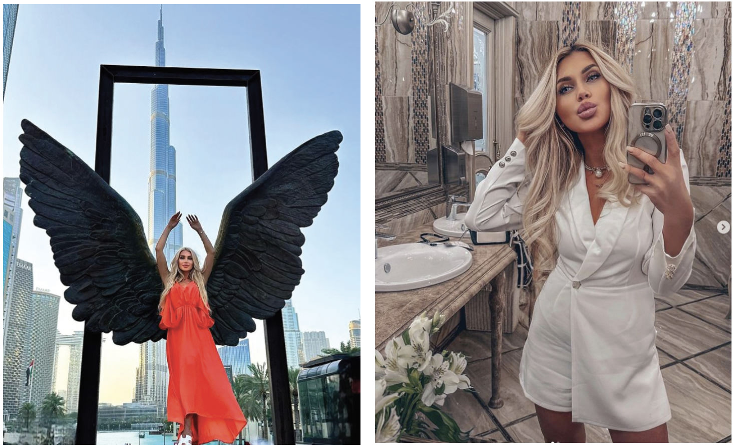 There, Zotova posts what she describes as “beautiful little photos” in the style of “glamour, chic, splendor, luxury, and fine dining.” She shares with her followers her stilettos and diamonds, bikinis and miniskirts, her evening skincare rituals, and luxury brands. On the food side, there are photos of figs with brie, fresh strawberry tarts, baked mussels, and lacy pancakes with red caviar. On her travels, Zotova can be seen on the beaches of Egypt with her new Prada glasses, riding a Dubai hotel’s 53-stories-high glass slide, “falling into a pink cloud” at a Barbie beach in Thailand, and sipping Moët & Chandon from a champagne flute in the Dominican Republic. Back home in Magnitogorsk Oxana is taking bubble baths with a martini or floating in a hammock in an aerostretching class. “The plan for today is to shine!” she writes.