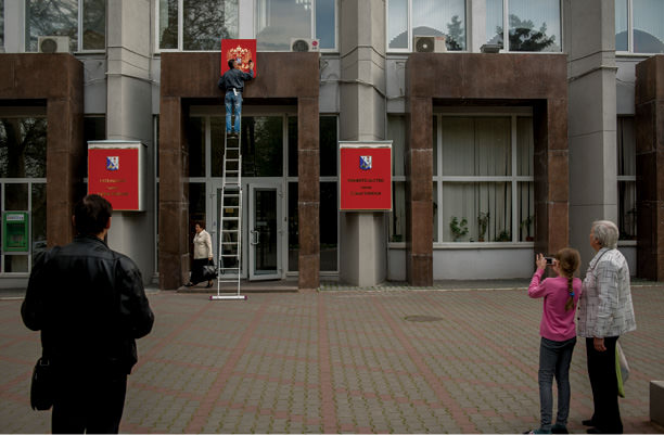 I came to Crimea for the first time in April 2014. I had been in Sevastopol for several days, mostly working in the city, when I saw workers hanging the Russian state insignia on the City Hall building one evening. Before that, I did not take note of the building’s empty façade; the Ukrainian state symbols must have been taken down in March, after the referendum to join Russia. It took the new authorities more than a month to acquire and hang the new coat of arms, but when it finally happened, passersby stopped and took pictures.