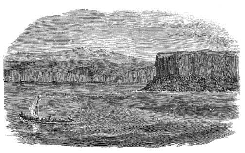 A Russian bidarra under sail in the Bering Sea. Engraving from a sketch by William Dall.