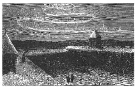 Nulato’s courtyard during a winter’s night, lit by the aurora borealis. Engraving from a sketch by Frederick Whymper.