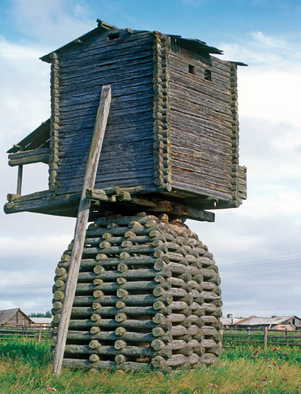 A log windmill, no longer in use.