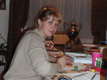 Natalia Majors paints birdhouses, jewelry boxes, and other household objects using traditional pryalki designs. She is of Russian-Belarussian heritage and grew up in a Soviet military family, spending her childhood in Moldova. Today she is a professional quilter and lives in Colorado. While she has never visited the remote Russian North, she says that, even as a child, she was intuitively drawn to the region’s folk art, an interest she shares with her mother, a watercolorist who paints Northern Russian churches and landscapes. Only as an adult did Majors discover an ancestral connection: her great-great-great-grandfather was from Arkhangelsk.