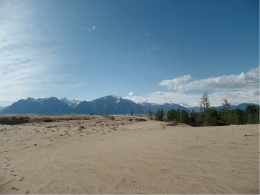 Nothing but sand as far as the eye can see. Desert sand – or are they dunes? Dark mountains on the horizon, capped with snow. I’ve trekked out here with Sergey Logvinenko, more than an hour through woods and marshes, branches and brushwood, with pools of water everywhere. At first they resemble sand dunes, with a few pines here and there, but gradually the hills become bigger and more barren. It’s a dramatic sight, all of this sand with snow-topped peaks in the distance. A little further on, we see a small lake with a wall of sand as its backdrop. These sand drifts in the middle of Siberia, on the perpetually frozen soil, created thousands of years ago at the foot of a glacier, are unique. We trudge on through the loose sand, to the bare spots where nothing can grow.