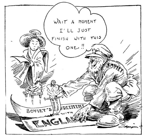 The man, a White Russian émigré named Georgy Avksentiyevich Sapozhnikov, worked for the North-China Daily News, the most prestigious newspaper of the period and the mouthpiece of British interests in the Far East. A political cartoonist of great talent and perceptiveness, Sapozhnikov daily created sketches that were avidly devoured by subscribers. In fact, he was so popular that when he went on extended holidays the newspaper refused to hire a temporary replacement.