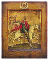 Interestingly, the church’s history led to the tradition of portraying Saint Tryphon with a horse, despite the fact that there was nothing in the life history of this saint or in the common prayers addressed to him to justify this. On Greek icons he was always portrayed on foot, with cross in hand. Yet in Russian iconography we may see him on foot or astride a horse, but always with a bird as his basic symbol in both church and lay biographies. It is also noteworthy that in the fifteenth century so great was the significance of falconry that portraying a rider with a bird had the status of a state symbol and was printed on coins.