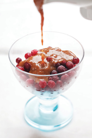 Place frozen cranberries in individual serving dishes, and pour the hot caramel sauce over them. (In summer you can cool it slightly to pour over fresh berries.)