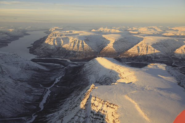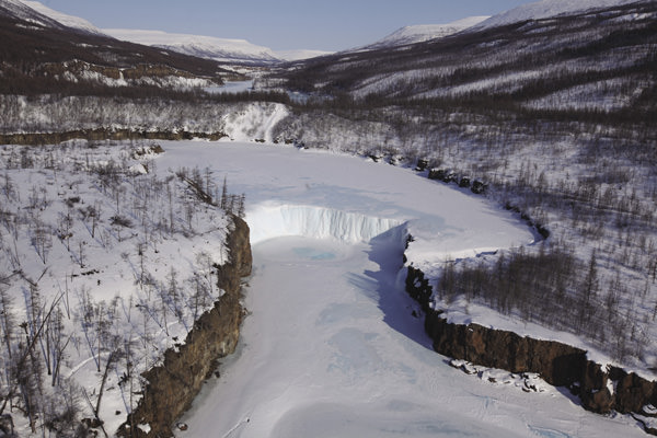 We flew across the central portion of the Plateau. It was a region of stone blocks and snow. The surface of the Putorana Plateau looked as if it had been smoothed out by a huge rolling pin, then dusted with basalt boulders. Spanning the banks of narrow river valleys, looking a bit like white seagulls, were ice bridges. The valley floors were overgrown with thick forests, and as we flew over the Khana-Makit ridge, I suddenly thought I heard the sound of a wolf’s howl. In the distance, the huge expanse of Lake Ayan spread before us.