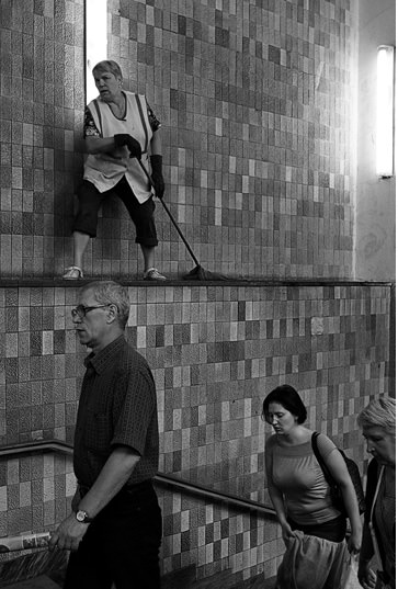 “This was at the entrance to the underground passage that leads to Kitai-Gorod metro station. I had seen these women working several times and always marveled at their bravery. I tried shooting them a few times, but always something got in the way, someone turned away, or something else; and I needed to get this image showing both levels. I am still a bit unhappy with some aspects of this image, particularly how the people on the stairs turned away at just the moment I clicked the shutter. I would have liked it if there were equivalence above and below.”