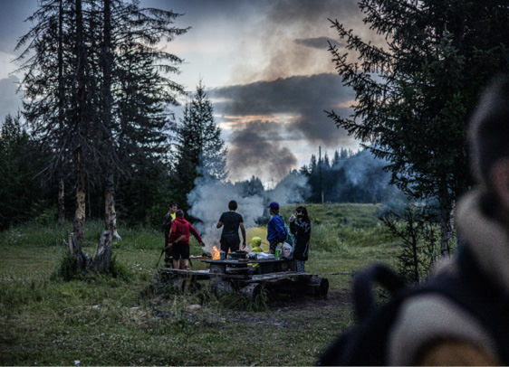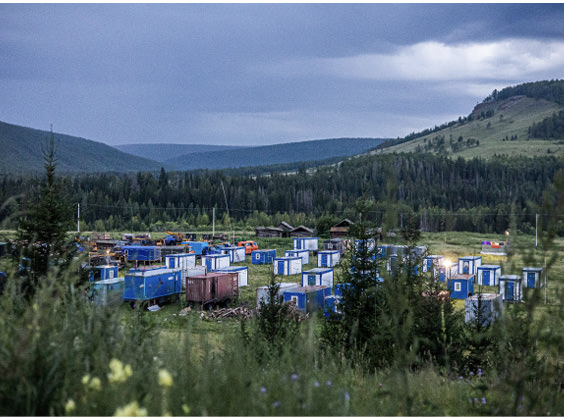 From the road above, the geologists’ camp near the village of Zhitova is clearly visible. Blue-and-white trailers are scattered across the field. Local guide Konstantin Melentyev – Roman’s eyes and ears on the ground – shows us the Ural trucks with their blue cabs – they’re used specifically to transport explosives. There’s an armored personnel carrier next to them.