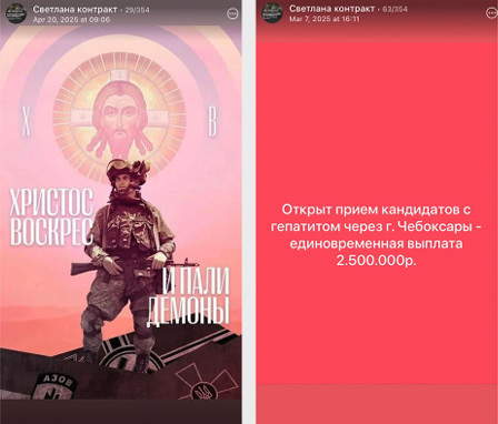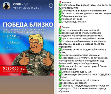 Recruiters tell prospective recruits to sign up in different regions, where the payments and benefits may be more attractive. Telegram channels are awash with ads from across Russia showing different payments and benefits, displaying ads with curator phone numbers.