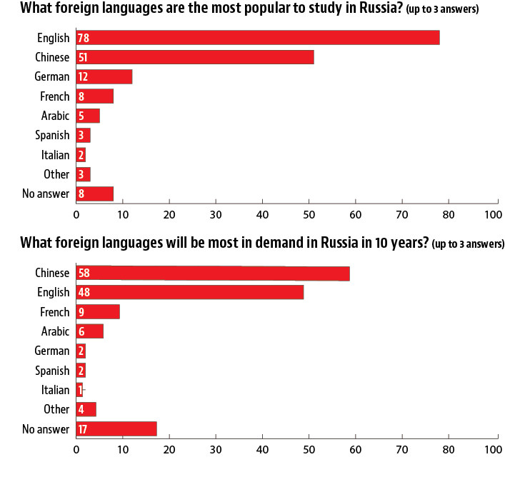 In a poll gauging Russians’ knowledge of foreign languages, 40% said they have at least minimal knowledge of English, 12% have some German, and 3% have French. Arabic, Spanish, Chinese and Italian were named by 1%; 6% named yet another language, and 46% said they don’t speak any foreign languages. Among those that know foreign languages, 7% use it at work, 7% use it watching movies and series, 6% use it when traveling, 6% uses it to help friends and family with translations, 5% read news articles, 5% communicate with foreign friends, and 4% read books. 27% said they don’t use their language skills. 70% said they wouldn’t want to learn another foreign language, and 76% believe they don’t actually need it.