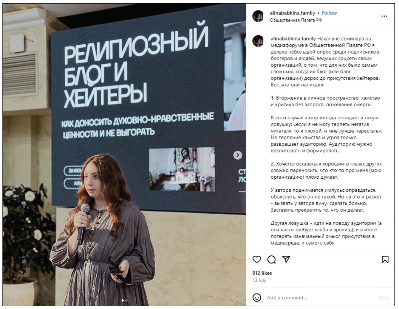 Babkina is currently one of the most popular Orthodox matushka bloggers, with an audience ten times greater than the others, who have from 5,000 to 20,000 subscribers.