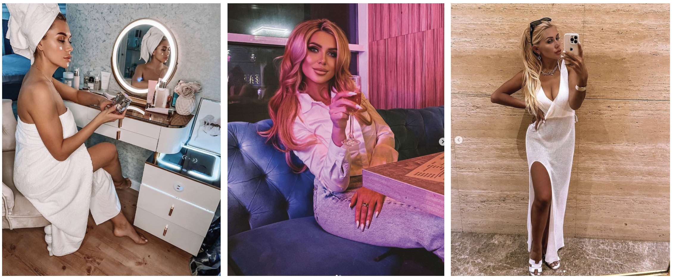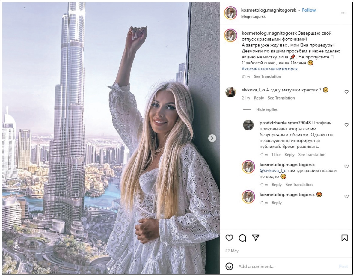 There, Zotova posts what she describes as “beautiful little photos” in the style of “glamour, chic, splendor, luxury, and fine dining.” She shares with her followers her stilettos and diamonds, bikinis and miniskirts, her evening skincare rituals, and luxury brands. On the food side, there are photos of figs with brie, fresh strawberry tarts, baked mussels, and lacy pancakes with red caviar. On her travels, Zotova can be seen on the beaches of Egypt with her new Prada glasses, riding a Dubai hotel’s 53-stories-high glass slide, “falling into a pink cloud” at a Barbie beach in Thailand, and sipping Moët & Chandon from a champagne flute in the Dominican Republic. Back home in Magnitogorsk Oxana is taking bubble baths with a martini or floating in a hammock in an aerostretching class. “The plan for today is to shine!” she writes.