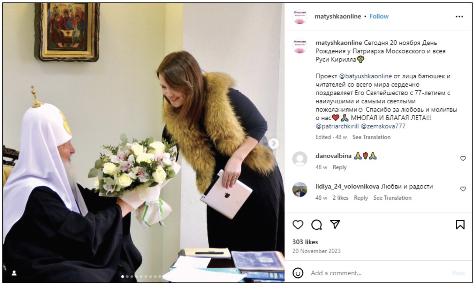 The Yekaterinburg journalist Ksenia Volyanskaya admits that for the past two years she’s hardly looked at any Orthodox accounts because she “really doesn’t care what all those people think and say, since it has nothing to do with reality, unfortunately.” She adds: “What may have looked funny before can look repulsive against the backdrop of what’s happening now.” Ksenia feels that whatever might be nice about pictures of food and church fashions is canceled out by “the weaving of camouflage nets and humanitarian aid for the troops.”