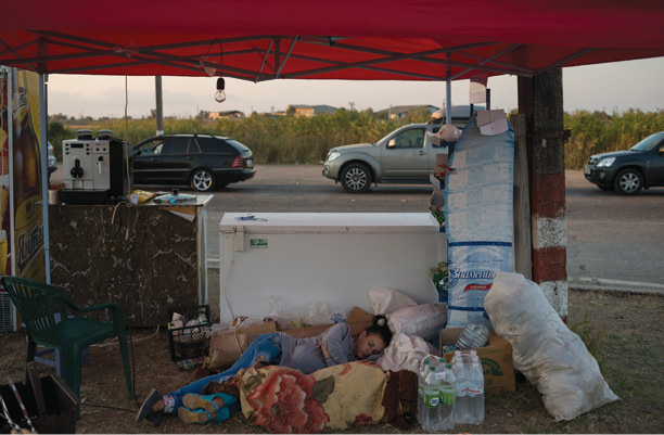 In late July I visited Crimea for a second time, driving there from Krasnodar region. If before, traffic had been flowing from Krasnodar toward the peninsula, now the ferry crossing was full of Russian vacationers returning from Crimea to the mainland. The traffic back-up began in the town of Kerch and stretched several kilometers to the port; some people waited days to board the small ferry. The traffic was making news and I was asked to investigate it. I got up at five, to photograph as the crowds were waking up, and saw a makeshift kiosk as I trotted past the queue. Two women had set it up to sell food and refreshments to drivers who could not leave the line. They were so tired they just slept right at their “workplace.”