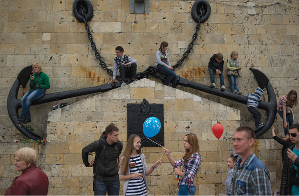 Never had I witnessed a May 9th Victory Day celebration that was a true people’s holiday. In Sevastopol last year it seemed like the entire city had spilled out onto the streets. Crowds gathered at the embankment to watch the parade of ships and the Russian air force squadrons Strizhi and Russian Knights. The lavish ceremony was overseen by President Putin. This street scene was captured between events.