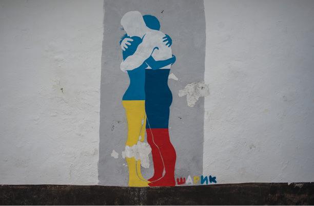 Sharik, a graffiti artist in Crimea [see Russian Life May/June 2014 ], has said he avoids politics and does not like painting anything that would be seen as a commentary on the situation in Ukraine. Apparently he has changed his mind, as evidenced by this new image found in the town of Sudak, near a local yacht club. The Russia-Ukraine embrace appeared on a wall this summer, local yachtsmen said.