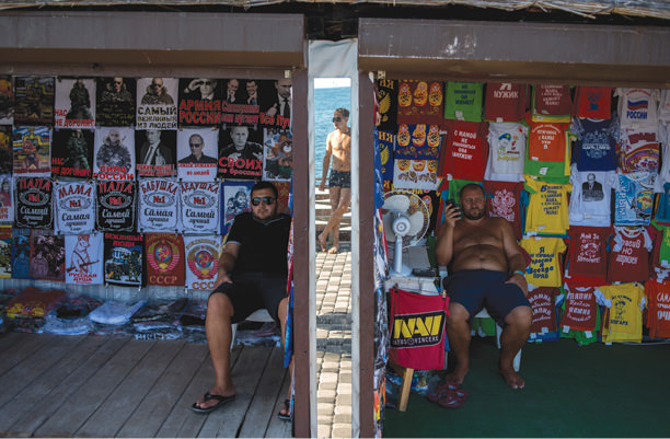 At the Yalta seaside resort, kiosks offer T-shirts touting President Vladimir Putin as “the most polite of people,” or as “the force of Russia.” Others simply show him sporting dark sunglasses, a winter parka, or camouflage fatigues. Once popular retro-Soviet imagery is now less popular. Although ubiquitous in the kiosks, I have seen few people actually wearing Putin shirts, which are apparently popular only as souvenirs.