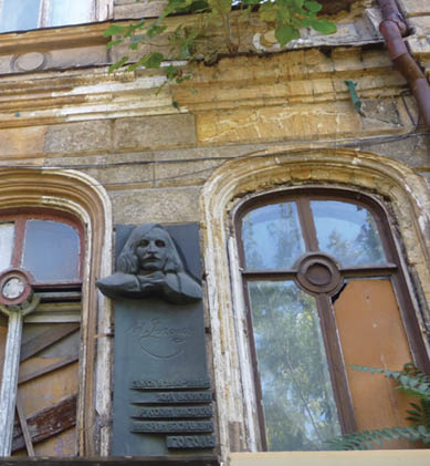 Yet just across the street, the home where Gogol stayed during his visit to Odessa is vacant and abandoned; the windows are boarded up; on the walls, the paint is peeling and vegetation is growing; the roof looks like it is about to cave in. Two memorial plaques – one in Russian, the other in Ukrainian – inform passersby of the home’s historic significance: