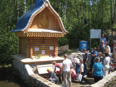 Marina Chuchikova, who works at the icon kiosk, spoke with pride about the quality of the water in comparison to another holy spring in Omsk, “I went to the Achairsky Monastery... It’s also a good place, of course. But the water there is warm. Our spring... it’s just fresher somehow, like spring.... Someone had called the Sanitary Epidemiological Station and said that our water was bad and that they had found the TB bacillus in there. And they came, five of them, from the Sanitary Epidemiological Station in Novosibirsk and they tested the water with some new machine. They were amazed and said, ‘This water is fantastic! It exceeds all their parameters... A bacillus can’t even exist in there.’ ”