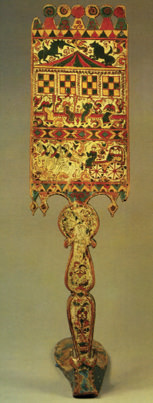 Villagers made and used pryalki in many of the same towns where icon writing flourished, and folk artists adapted some of the materials and techniques used in icon writing to construct and decorate distaffs. Commonalities between icons and pryalki include portability, their presentation on wood, the preparation of the ground (a base layer between the wood and paint), and the use of egg tempera paint and gold leaf. The owners of both icons and pryalki used them daily and gave each places of ritual importance inside their homes. And while icons are said to provide Orthodox Christians with a window to God and his divine realm, distaff artists use the same word – “windows” – to describe how they divide the blade into painted sections. Each window provided glimpses, not of God, but into an embellished, fairy-tale version of village life. Meanwhile, the motifs reminded villagers of a pre-pagan world controlled by natural forces. Pryalki kept alive distant mythical references inherited and adapted from ancient Kievan Rus.