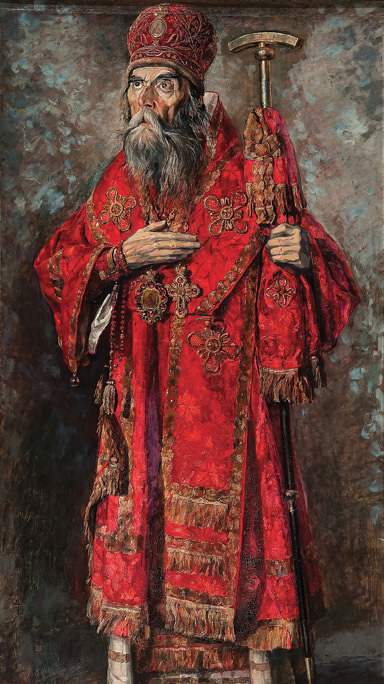 He planned the painting to be a tapestry of both notable Church figures and national archetypes: peasants, beggars, and the traditional character of the holy fool. For the latter, Korin recruited a blind singer from a Moscow church, who is pictured conducting an invisible orchestra.