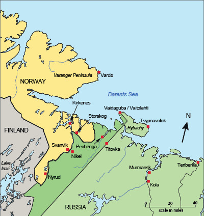 The Barents Sea region includes the northernmost reach of the mainland of European Russia. This area is part of the Murmansk Oblast; it lies between 69°N and 70°N – a broadly similar latitude to Alaska’s North Slope – and is bounded on the north by the Barents Sea, part of the Arctic Ocean. Norway, which shares a short common border with Russia, lies to the west and there the mainland extends well north of the 70th parallel. Finland lies to the southwest. Russian influence was rarely constrained by those borders, however. In fact, Finland was part of the Russian Empire during the late-tsarist period. And prior to the border between Norway and Russia being agreed upon in 1826, the entire Varanger Fjord area (now in Norway) was part of the fellesdistrikt, a formidably barren region administered jointly by Russia and Norway.