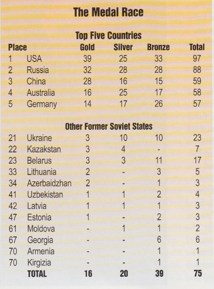 The untold story of the 2000 Sydney Olympics is this: the winner in the overall medals race was not the US, but the USSR. Sure, the USSR no longer exists, but that is just “a technicality.” The lingering shadow of the huge Soviet Athletic Machine was apparent at Sydney. Taken together, the states that once comprised the Soviet Union brought home a total of 163 medals, 48 of them gold (see chart, page 20). And this does not even count former Soviet athletes competing for non-CIS states (including the US) ...