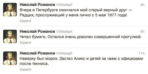 Tsar Nicholas II: An account that posts real diary entries by Russia’s last tsar, who was known for his brevity and lack of existential reflection. The person keeping the blog posts items on the same month and day as Nicholas’ original entries. Apparently, what the monarch loved most was walking outside, reading, and drinking tea.