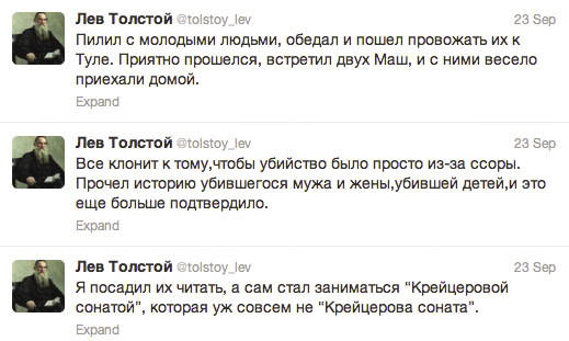 Twitter is alive with tweets by the greats of Russian literature and history, who sometimes report on their lives as if in the past and at others offer biting commentary on current events. Among the more interesting tweets from the past are: