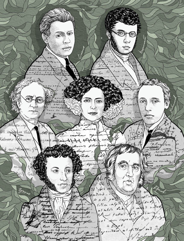 A literary montage by artist Taisiya Kulygina. Left to right, top to bottom, are the poets Yesenin, Baratynsky, Tyutchev, Gippius, Khlebnikov, Pushkin, Krylov.