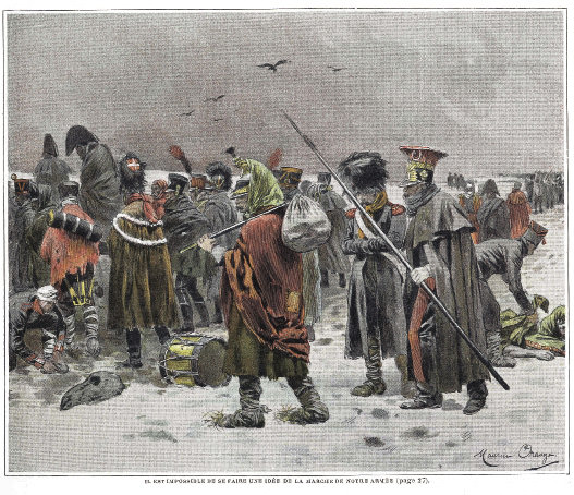 [Near Oshmyany], some 40 or 50 versts [twenty-six to thirty-three miles] from Vilna, we encountered sights the likes of which we have never seen before, even on the battlefield. The cold was permanently at -30 degrees, with severe blizzards and wind that blew into our faces. Naturally, we and the French suffered the same bad weather, but the difference was that we were more or less accustomed to it, while they were not. We suffered terribly nevertheless. I saw very often even how the Guards soldiers froze to death on the side of the road while I was unable to help them. [As a rule], when a soldier became tired and unable to march, he was left behind, accompanied by a healthier and stronger soldier, to wait for the transports that moved in the wake of the corps. But because both civilian and transport horses were not properly shod, they could barely move on the frozen roads and arrived at bivouacs only [in the evenings] or the following day, when the regiments had already departed. In the meanwhile, the weakened soldiers and their companions fell into a sleep that knows no breaking; such a death was less dreadful for the weaker soldier [who died first] than for the healthier one, who could see his fate….