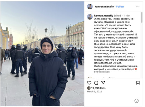 This was the comment 28-year-old Kamran Manafly, a geography teacher at Moscow School No. 498, posted on social media in the spring of 2022 alongside a picture of himself at an antiwar protest. He was fired several days later for “immoral behavior.”