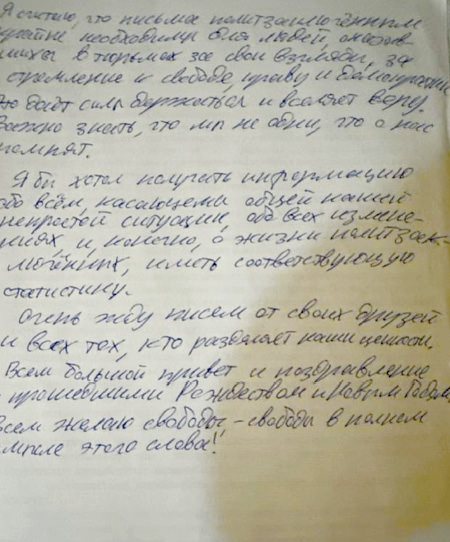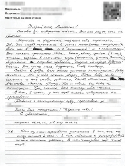 There is a good chance that foreign stamps and envelopes will prevent letters coming directly from abroad from reaching their addressees. Olga Stepanova said that such letters are simply confiscated once they arrive at the prison.