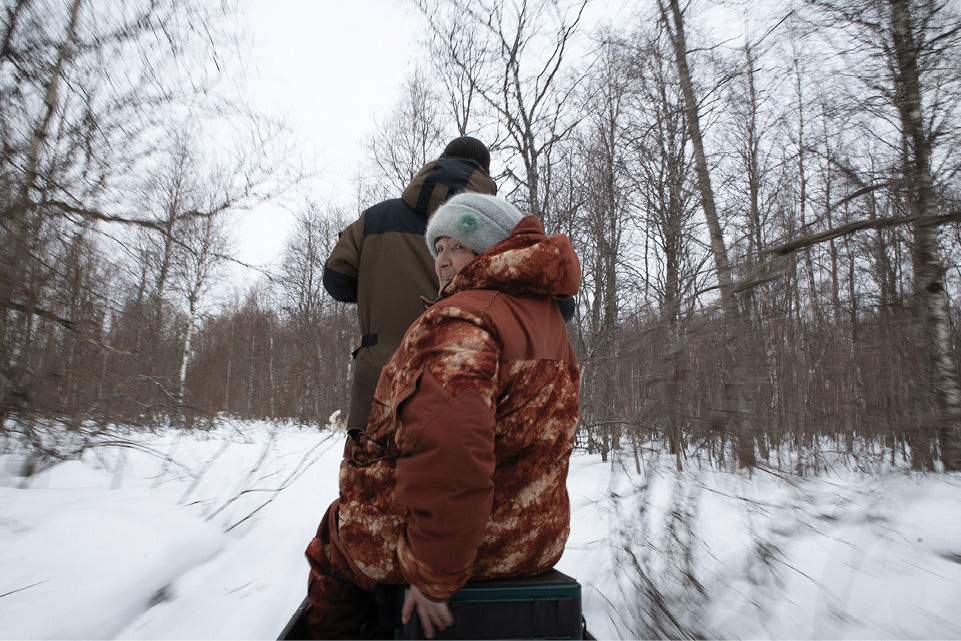 When the photographer and writer are frozen through, Nadezhda takes out a thermos and some bread and sausage. She chews slowly, looking off into the snowy distance. I ask her to recall her happiest day fishing.