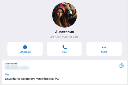Victoria’s avatar is blonde with long, false eyelashes and a plunging neckline. On Telegram she advertises military service as “a worthy choice for a patriot” and illustrates her posts with an image of a soldier in a helmet and telnyashka – the distinctive striped undershirt worn throughout the Russian military.