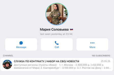 We asked Victoria about her work. She listed the pluses: she earns at least R300,000 ($3,725) per month, has a flexible schedule, can do other jobs. She started recruiting recently, thanks to a friend. In January 2025, an acquaintance invited her to join an agency that has agreements with “various Voenkomats,” and hires “managers.”