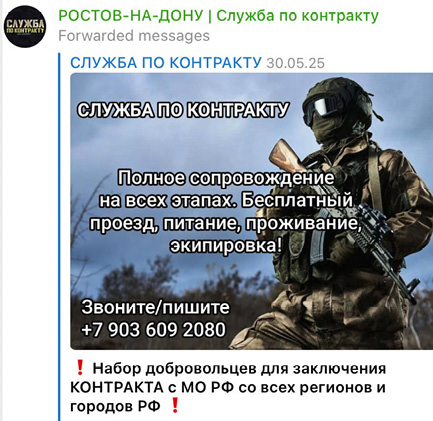 For example, for R45,000 ($585) Telegram will publish a recruiter’s ad in hundreds of online communities for particular cities that masquerade as groups with civilian job openings while encouraging signing up for the “SVO” (Special Military Operation): “Work in St. Petersburg” or “Voronezh Oblast jobs.” In each case, the post will appear 30 times, but it is difficult to gauge its effectiveness.