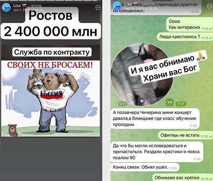 Yelizaveta posts screenshots on social media of her correspondence with her recruits, showing how she asks them to write her weekly, how she asks if they have received their payments, and makes them promise to return home.