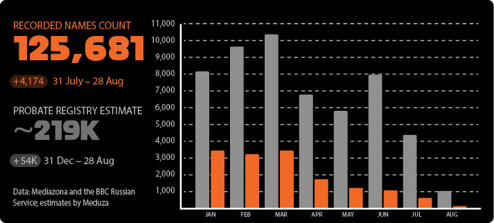 A media investigation by the Mediazona and Meduza news websites into the number of Russians who have died fighting in Ukraine has arrived at an estimate of 219,000, including 125,681 who are known by name from various media, government, or family announcements, or other online sources. The names are being documented on the website 200.zona.media. Additional figures are calculated via a methodology using probate registry data. Another Russian media website, IStories.media, has published its own estimate of 117,978 deaths, using a neural network that trawls the internet for reports of deaths and publishes them on its own specialized database called Kharon («Харон» – база данных о российских потерях в войне с Украиной). The Russian government does not publish any official figures about military casualties in Ukraine.